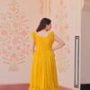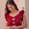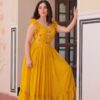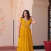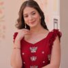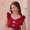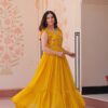 Elegant faux blooming fabric gown with stunning sequin, multithread, and bead embroidery. Features a 7-meter flair, fancy V-neck, and sleeveless design with double frill shoulder stitching. Fully lined with soft cotton for comfort. Available in maroon, yellow, and purple. Perfect for festive, wedding, or party occasions.