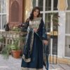 Presenting an elegant Faux Blooming gown, exquisitely adorned with embroidery, zari, and sequins work. This comfortable ensemble features a full cotton lining, full sleeves, a round neck, and a magnificent 3.5 MTR flair. It comes with a matching Faux Blooming dupatta featuring sequins work and a designer lace border. Available in sizes M-XXL and two colors, priced at the best rate of ₹4,100.00.